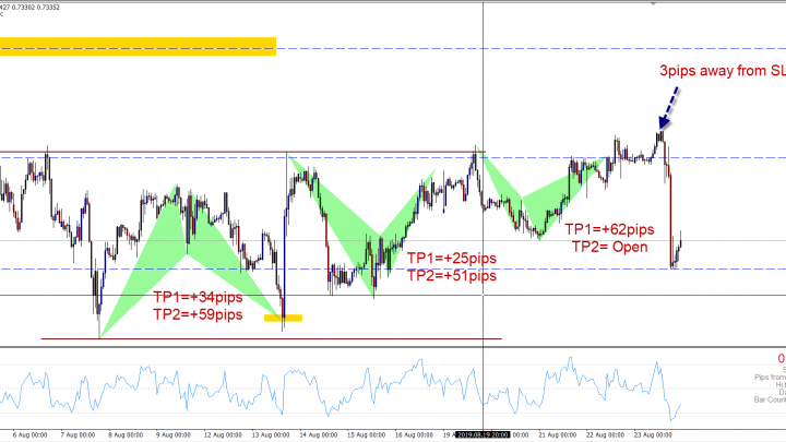 AUDUSD was in a consolidation mode for weeks and the Harmonic Pattern captured an simple +62pips last week. This coming week is filled with lots of Economic Data, expecting a break out of this consolidation