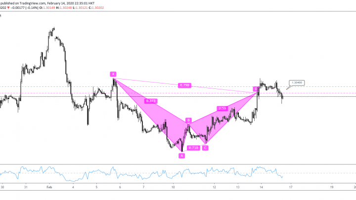 Feb 14 2020 (EP #40) Kelvin 交易策略 – GBPUSD 蝙蝠形态 2020-02-14在一小时图中, 有一个熊势的蝙蝠形态已经形成。 它提供的反转区间是在1.30470-1.30300之间。