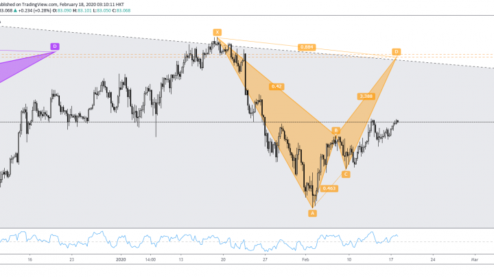Feb 18 2020 (EP #41) Kelvin 交易策略 – CADJPY 蝙蝠形态 2020-02-18在四小时图中出现一个熊势的蝙蝠形态, 它带来的反转区间是在84.260至 84.210之间。