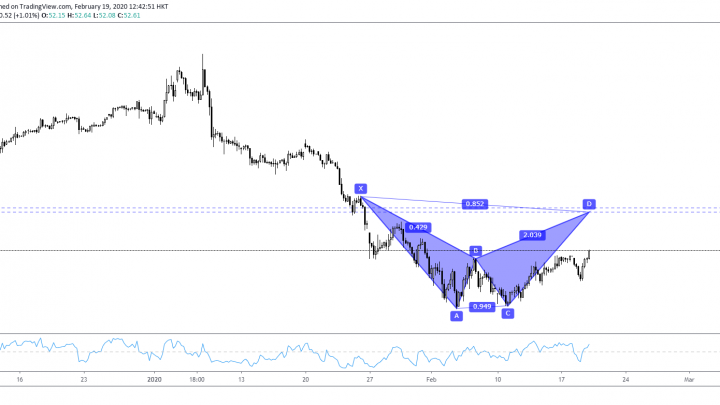 Feb 19 2020 (EP #42) Kelvin 交易策略 – USOIL 蝙蝠形态 2020-02-18在四小时图中, 有一个熊势的蝙蝠形态出现, 它提供的反转区间是在55.185至 54.930之间。