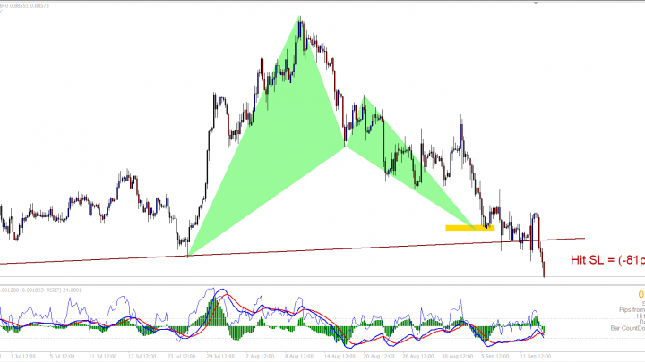 EURGBP is currently driven by fundamentals, the ECB and Brexit. A failed Bullish Bat Pattern last week, indicating to us that there will be more downside in the coming weeks.