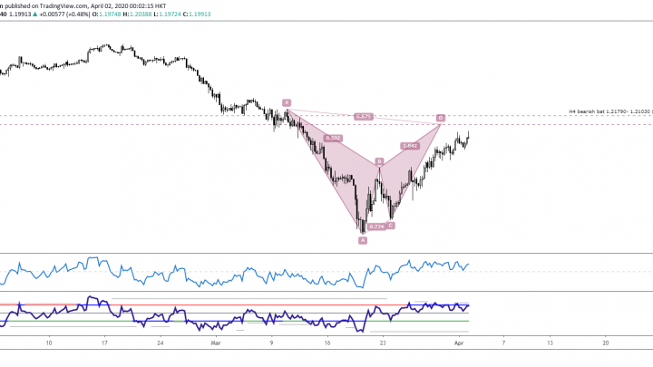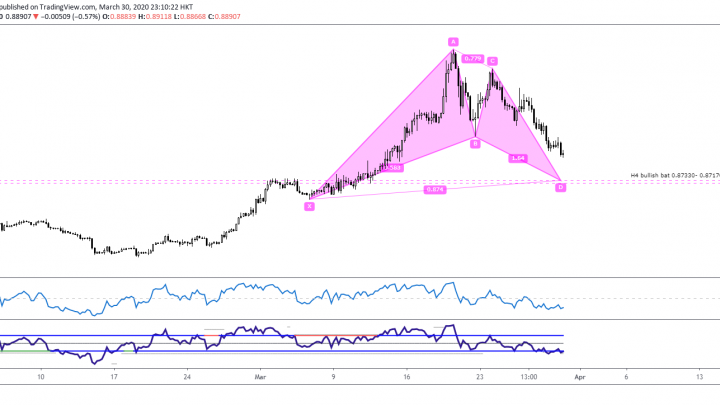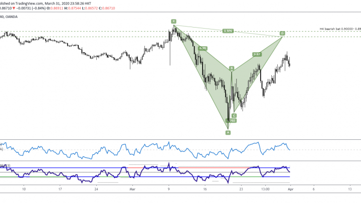 Mar 31 2020 (EP#72) Kelvin 交易策略 EURGBP 蝙蝠形态 2020-03-30在四小时图中, 市场有一个牛势的蝙蝠形态出现, 它带来的反转区间是在0.87330至 0.87170之间。