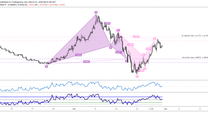 Mar 31 2020 (EP#73) Kelvin 交易策略 EURUSD 蝙蝠形态 2020-03-31市场在经历完牛势的紫色蝙蝠形态之后, 展现一波高达480pips的升势。 现在市场有一个熊势的蝙蝠形态(粉红色)快要完成, 它带来的反转区间是在1.11700至 1.11170之间。