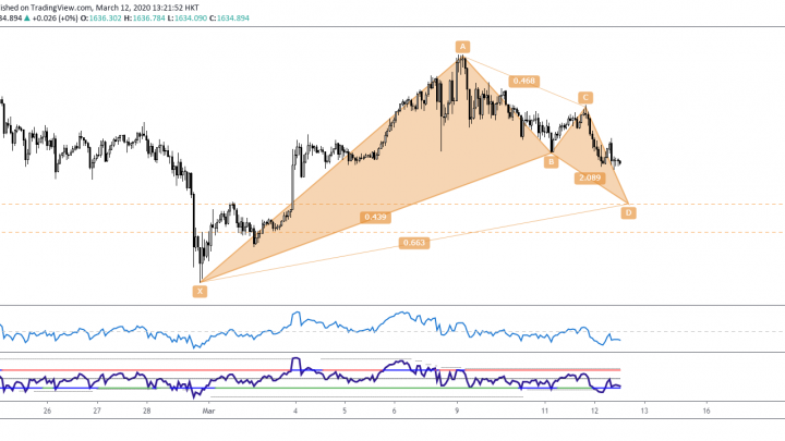 Mar 12 2020 (EP #60) Kelvin 交易策略 – XAUUSD 蝙蝠形态 2020-03-12在一小时图中, 有一个牛势的蝙蝠形态出现, 它带来的反转区间是在1610至 1593之间。