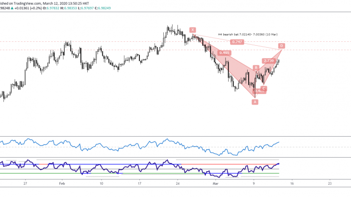 Mar 12 2020 (EP #61) Kelvin 交易策略 – USDCNH 蝙蝠形态 2020-03-12在四小时图中, 有一个熊势的蝙蝠形态, 它带来的反转区间是在7.02140至 7.00360之间。