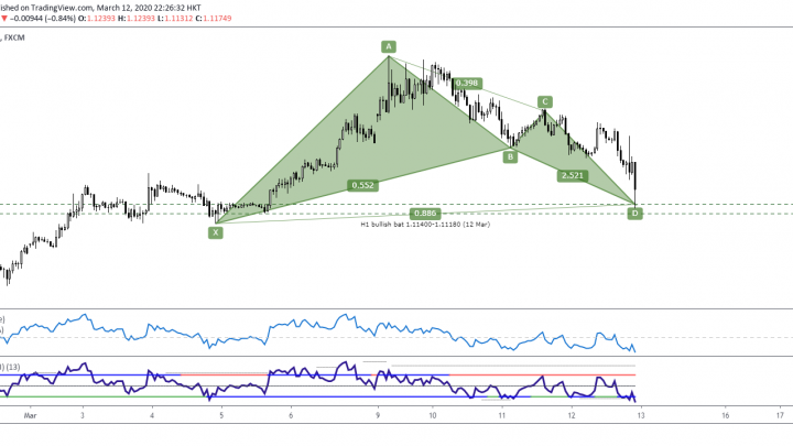 Mar 13 2020 (EP #62) Kelvin 交易策略 – EURUSD 蝙蝠形态 2020-03-12在一小时图中, 有一个牛势的蝙蝠形态快要完成, 它提供的反转区间是在1.11400至 1.11180之间。