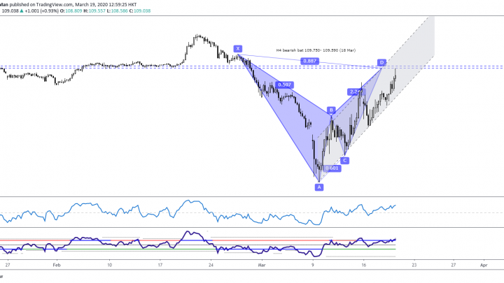 Mar 19 2020 (EP #64) Kelvin 交易策略 – USDJPY 蝙蝠形态 2020-03-19在四小时图中, 有一个熊势的蝙蝠形态快要完成, 它带来的反转区间是在109.750至 109.440之间。