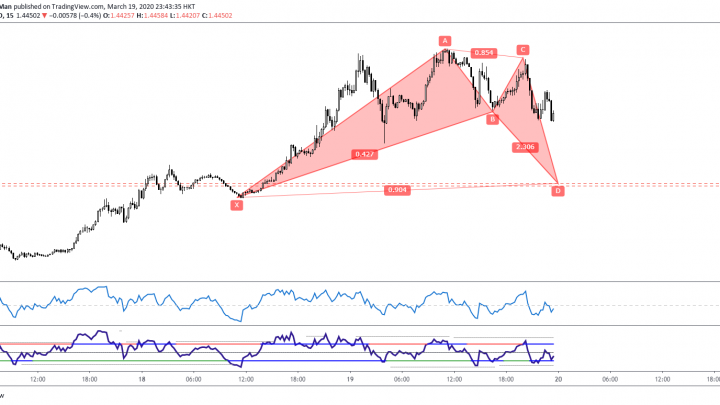 Mar 20 2020 (EP #65) Kelvin 交易策略 – USDCAD 蝙蝠形态 2020-03-19在十五分钟图形中, 有一个牛势的蝙蝠形态出现, 它提供的反转区间是在1.42160至 1.42070之间。