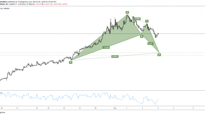 Mar 05 2020 (EP #55) Kelvin 交易策略 – EURAUD 蝙蝠形态 2020-03-05在一小时图中, 市场有一个牛势的蝙蝠形态, 它带来的反转区间是在1.65590至 1.65210之间。