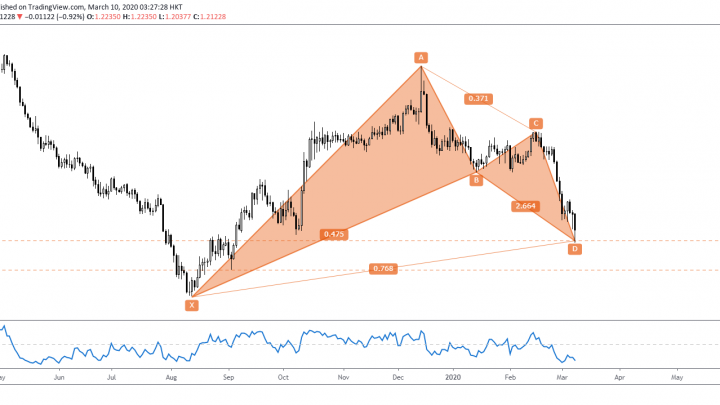 Mar 10 2020 (EP #56) Kelvin 交易策略 – GBPCHF 蝙蝠形态 2020-03-10在日线图中, 有一个牛势的蝙蝠形态快要完成, 它提供的反转区间是在1.20500- 1.18515之间。