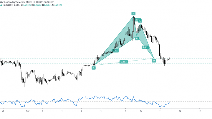 Mar 11 2020 (EP #57) Kelvin 交易策略 – GBPUSD 蝙蝠形态 2020-03-11在一小时图中, 市场有一个牛势的蝙蝠形态, 它带来的反转区间是在1.29150至 1.28820之间。