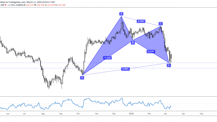 Mar 12 2020 (EP #58) Kelvin 交易策略 – GBPJPY 蝙蝠形态 2020-03-11在日线图中, 有一个熊势的蝙蝠形态已经完成。 它提供的反转区间是在133.900至 132.420之间。