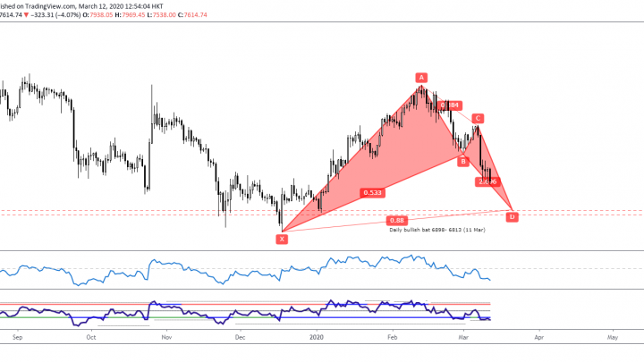 Mar 12 2020 (EP #59) Kelvin 交易策略 – BTCUSD 蝙蝠形态 2020-03-12在日线图中, 有一个牛势的蝙蝠形态出现, 它带来的反转区间是在6898至 6813之间。